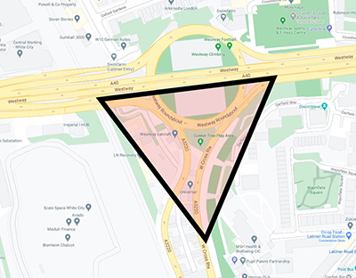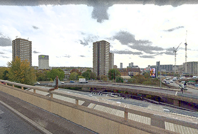 The best-guess location for the ‘real’ Concrete Island, based on Ballard’s descriptions in the book, is a small open space at the convergence of the Westway roundabout and the two southern spurs of the West Cross Route. Mike Bonsall goes into more detail about the discovery of the site in his excellent article in the Ballardian. It is within sight of White City to the west; Grenfell Tower to the east; and Imperial College London’s new ThinkSpace to the northwest. Now a major traveller site, here is an intersection of major road arteries, soaring concrete flyovers, and neglected urban wilderness, which fired Ballard’s dark imagination to create a city dystopia.