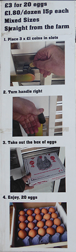 The instructions were on the left-hand side of the apparatus and were illustrated with photographs for additional clarity. The machine apparently dispensed batches of either twenty, a dozen, or single eggs, depending on how much money you inserted. I could see how a box of twenty eggs could be doled out fairly efficiently, but a single egg being disgorged from the mechanical vendor in a strange parody of how it must once have so recently been laid by an Old Broody chicken, looked like it was asking for a potential messy scramble on the pavement.