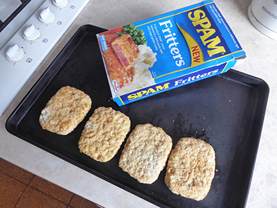 It is perhaps something of a misnomer to describe my subsequent cooking of these Spam fritters as a recipe. In truth, the steps involved were nothing more complicated than opening up the box, whacking them on a baking tray, and bunging them in the oven. But, hey! If it works for Nigella, it works for me.