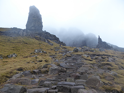 The closer I get, the more distinct is the outline of the Old Man from the jagged basalt teeth of the Storr beyond; the mist accentuates this distinction as it swirls sinuously in the channel between the two sets of rocks. It is a wild landscape of green, grassy slopes strewn by enormous black, fallen boulders, like the backdrop to an epic battle scene from Game of Thrones.