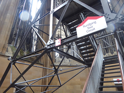 The entrance to the tower of Cologne Cathedral––it is the southern one, which is accessible––is outside the main cathedral, around the side of the building, and down some steps to a modern vestibule.