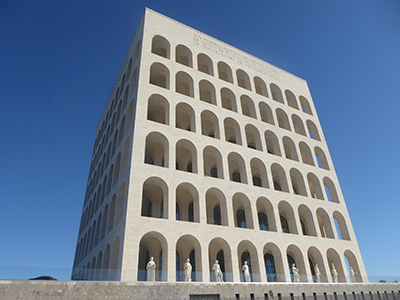Directly across from the train station, beyond a small park and a line of stone pine trees, one building rises prominently above a host of other neoclassical structures: the Palazzo della Civiltà Italiana is a stunning white cube of perfection. It is sometimes referred to as the Square Colosseum. Each vertical side of the cube has 54 arched openings in a regular 9×6 grid, giving the allusion that it is composed of more thin air than solid structure.