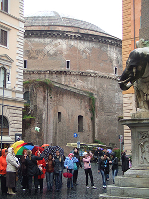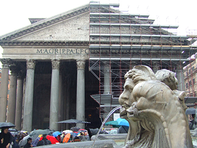 The Pantheon itself was not looking its finest. Half of it was shrouded in scaffolding; half exposed, like a simultaneous exhibition of before-and-after images. The crowd of umbrellas was thickest the closer I got to the entrance to the Pantheon. Some people were simply seeking shelter from the rain; many tourists were hoping for a look inside the ancient temple; I was there for a different reason. I had come to attend the Easter Sunday service.