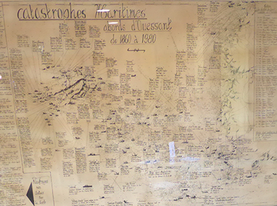 And then onward to Ouessant.  The outline of the island ahead is a reassuring presence.  I can feel it get nearer; see it getting nearer.  The sea remains blissfully calm.  I cannot believe my good fortune.  Nevertheless, my own fortune does not make me complacent of the potential hazards.  In my imagination, I can picture the wild seas, which more frequently batter this remote island and, should I have forgotten, in the first restaurant where I stop on the island, I sit beneath a large chart titled: ‘Catastrophes Maritimes abords d’Ouessant de 1860 à 1980’.