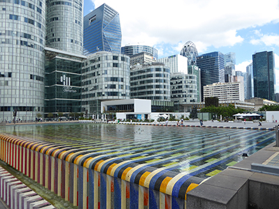 My transition from one world to the next is an innocuous glass elevator. A lift, which transports me from the old-world style of vieux Puteaux to 21st-century La Défense. It looks like the kind of lift where you are more likely to be stuck in a urine-soaked prison without recourse to help rather than a benevolent time-machine, but I put my faith in it, and my faith is duly rewarded. Five floors skywards, and here is the La Défense of my imagination, and more. I had always equated La Défense solely with the Grande Arche, but the scale of the entire area is so much more impressive.