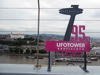 Standing at 95 metres, the UFO Tower is home to an open-air observation deck and restaurant at the southern end of the Most SNP (Most Slovenského národného povstania), the principal bridge spanning the Danube in the centre of Bratislava. The observation deck is shaped like the classic Sci-Fi interpretation of a flying saucer, and is accessed by a lift in the east leg of the structure. It seemed like the perfect vantage point to get the view of the Danube, which I was craving.