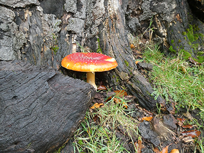 Amongst the trees to my left, a short path leads to a small, ruined brick bunker, once part of Bolehill Quarry, and further on, a tree sculpture, distorted and truncated, looks like the hide of some ancient reptile.