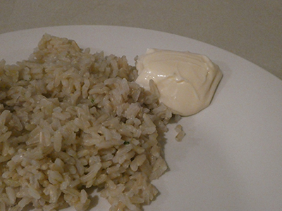 What was it that first made me combine rice and mayonnaise? A shortage, most probably. An absence in my cupboard of any other kind of condiment. Or perhaps it was just the happenstance of a lucky mistake; drunkenly reaching for a different sauce, and alighting on the mayonnaise instead. Whatever the chance of circumstances, which brought these two unlikely elements into the same alignment, I can only give thanks that I was present when it happened.