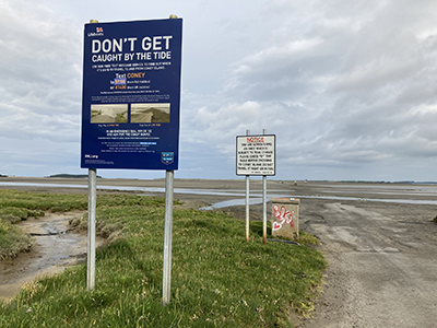 A large sign warns of the dangers of crossing; suggests a phone number to text to check tide times––unanswered. A large, bearded man emerges from a tent on the sand’s edge, his powerful motorbike parked alongside. The first of the fourteen stone markers is an obvious landmark directly ahead. I take my first steps onto the sand.