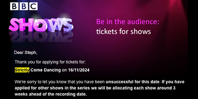 Another year, another Strictly Blackpool no-go. Every year, I enter the BBC lottery for tickets to see the show; every year, I fail to win. To give them their due, the BBC are very polite about informing me of my lack of success but, once, just once, it would be nice to receive that email from them that says I am a winner.