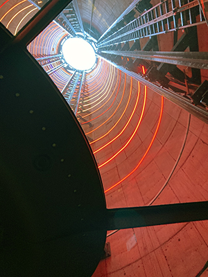 The final wait for the lift feels rather like being miniaturised inside a microfilm blueprint for a printed circuit board or on the set of an episode of Dr Who, 1970s vintage. But, if all that has gone before has been rather anticlimactic, there is a genuine sense of excitement as the big, circular lift begins to climb and blue sky is suddenly visible above.