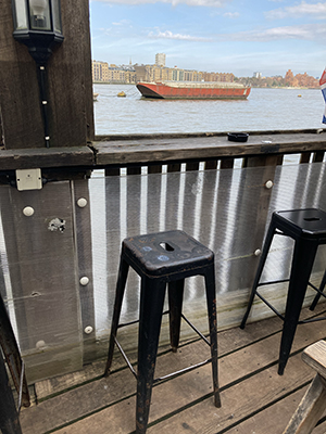 I took up a position on the deck, admiring the Thames view, a pint of Scurvy Ale in front of me. It was a sunny spring lunchtime. An expression including the words ‘pig’ and ‘shit’ would have described me.