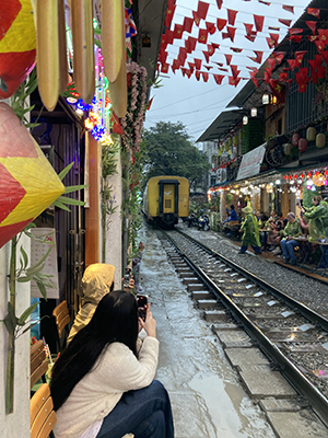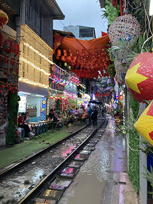Train Street, Hanoi (otherwise known as Ngõ 224 Lê Duẩn) is famous for being a busy pedestrian thoroughfare and a mainline railway track all at the same time. Tourists flock to sit at a Train Street café while the express to Ho Chi Minh City flashes by inches from their table.
