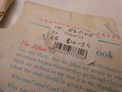 Normally, these price stickers will be slapped onto the rear panel of a precious dust wrapper. For some reason, charity shops seem to use the stickiest of stickers, too. It Is never possible to remove them seamlessly; they normally take with them half the precious text or picture from the surface of the dust wrapper, leaving behind an ugly white scar of defaced paper.