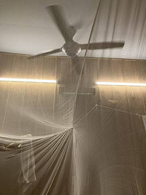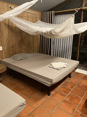 It is sunset by the time we arrive. I am on dry land but, beyond that, I still have little idea of my location. It is fully dark by the time I am shown where I will be spending the night. The room is nice. Very nice. Much nicer than I had expected. It is spartan but spacious. Two double beds. Both fitted with mosquito nets, I am pleased to see. A big ceiling fan. The bathroom? Well, there is a curtained-off door in the far wall. I wonder where that goes?